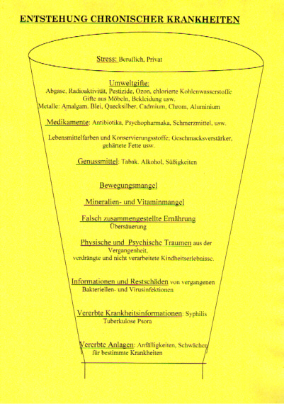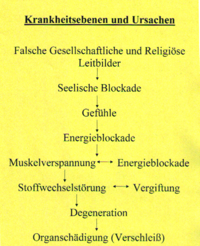 Die HOMÖOPATHISCH – BIODYNAMISCHE – THERAPIE nach Krill Die Wirkungsweise der HOMÖOPATHISCH – BIODYNAMISCHEN - THERAPIE beruht darauf dass durch die Körpertherapien die Körperenergie reguliert, und die Aura positiv beeinflußt wird. Zusätzlich wird durch die Homöopathie die Information positiv verändert. Dadurch ist eine grundlegende Heilung möglich. Die Konventionelle Medizin geht von einer materiellen und einer psychischen Ebene aus und ignoriert oder verleugnet die energetischen Ebenen unseres Körpers.Um die Wirkungsweise der Homöopathisch Biodynamischen Therapie erklären zu können muß ich zunächst einmal das Körper und Krankheitsverständnis neu definieren. Die grundlegende Modellvorstellung dazu ist: Unser Körper hat verschiedne Ebenen die miteinander in Verbindung stehen. 1.) die Molekulare Ebene (durch die Chemie teilweise beschreibbar) 2.) die Energetische Ebene im Bereich der Zellen 3.) die Energetische Ebene im gesamten Körper 4.) die Aura 5.) die Geistige Energie 6.) die Energie die alle Lebewesen auf der Erde miteinander verbindet Wer Körperarbeit macht, und einigermaßen Sensibel ist kann die Körperenergie und auch die Aura spüren. Im Gegensatz zur Schulmedizin, welche vereinfacht so denkt, das durch Viren und Bakterien eine Störung der Funktion des Körpers hervorgerufen wird, geht man in großen Bereichen der Naturheilkunde, zum Beispiel Akupunktur und Homöopathie davon aus, das primär eine Störung der Körperenergie vorliegt, welche sich erst nach unterschiedlich langer Zeit auf die materielle Struktur des Körpers auswirkt. Gelingt es dem Therapeuten die Körperenergie bei Beginn einer Krankheit wieder ins Gleichgewicht zu bringen, so bleibt die Krankheit aus, oder der Krankheitsverlauf wird sehr leicht. Da wir nicht nur aus Materie bestehen, sondern auch aus Energie, sind bei einer Erkrankung zunächst primär die energetischen Ebenen gestört, was sich auf das Wohlbefinden und die Funktionsfähigkeit des Körpers auswirkt. Analog zu den Körperebenen gibt es auch verschiedene Krankheitsebenen, welche ich in folgendem Schema darstellen werde |